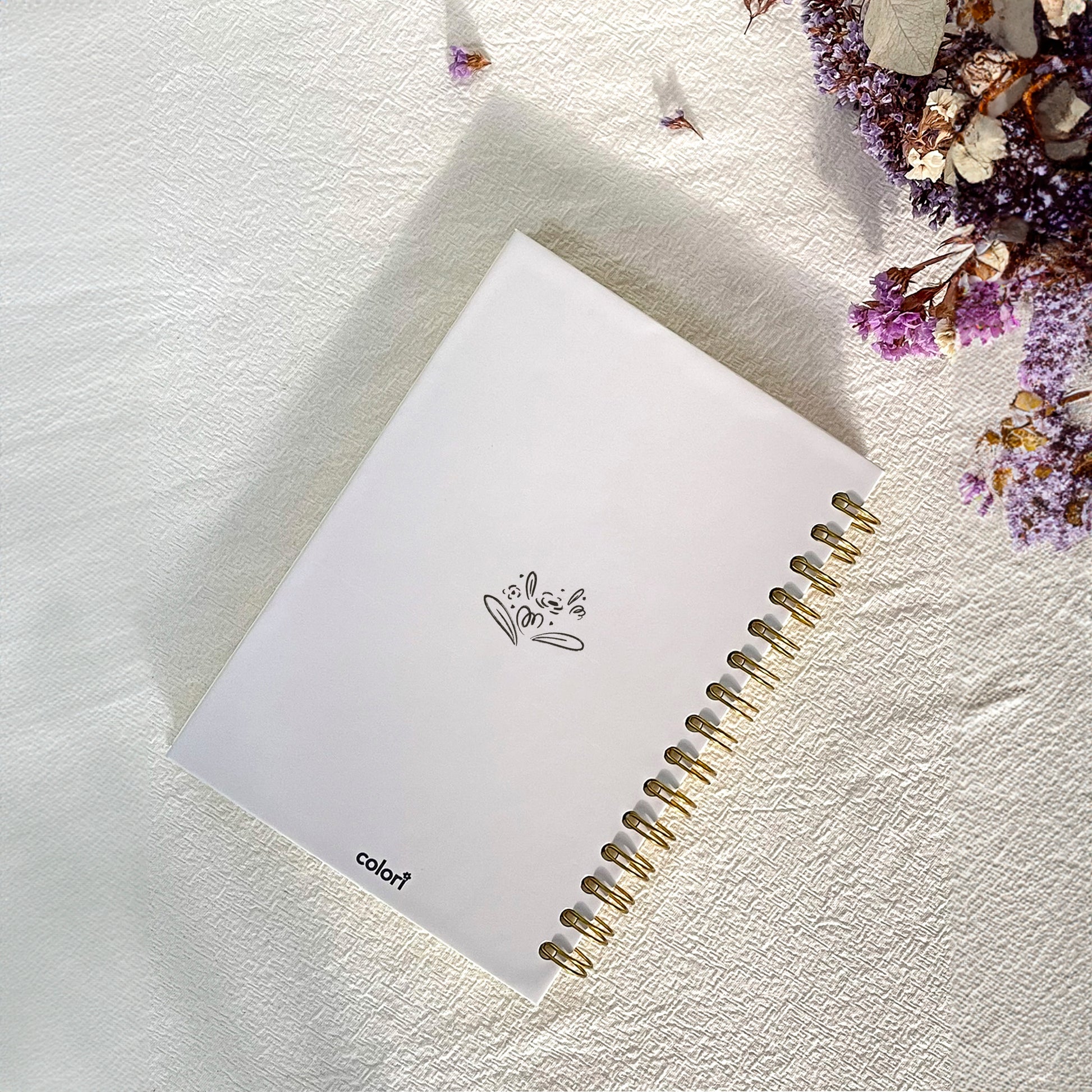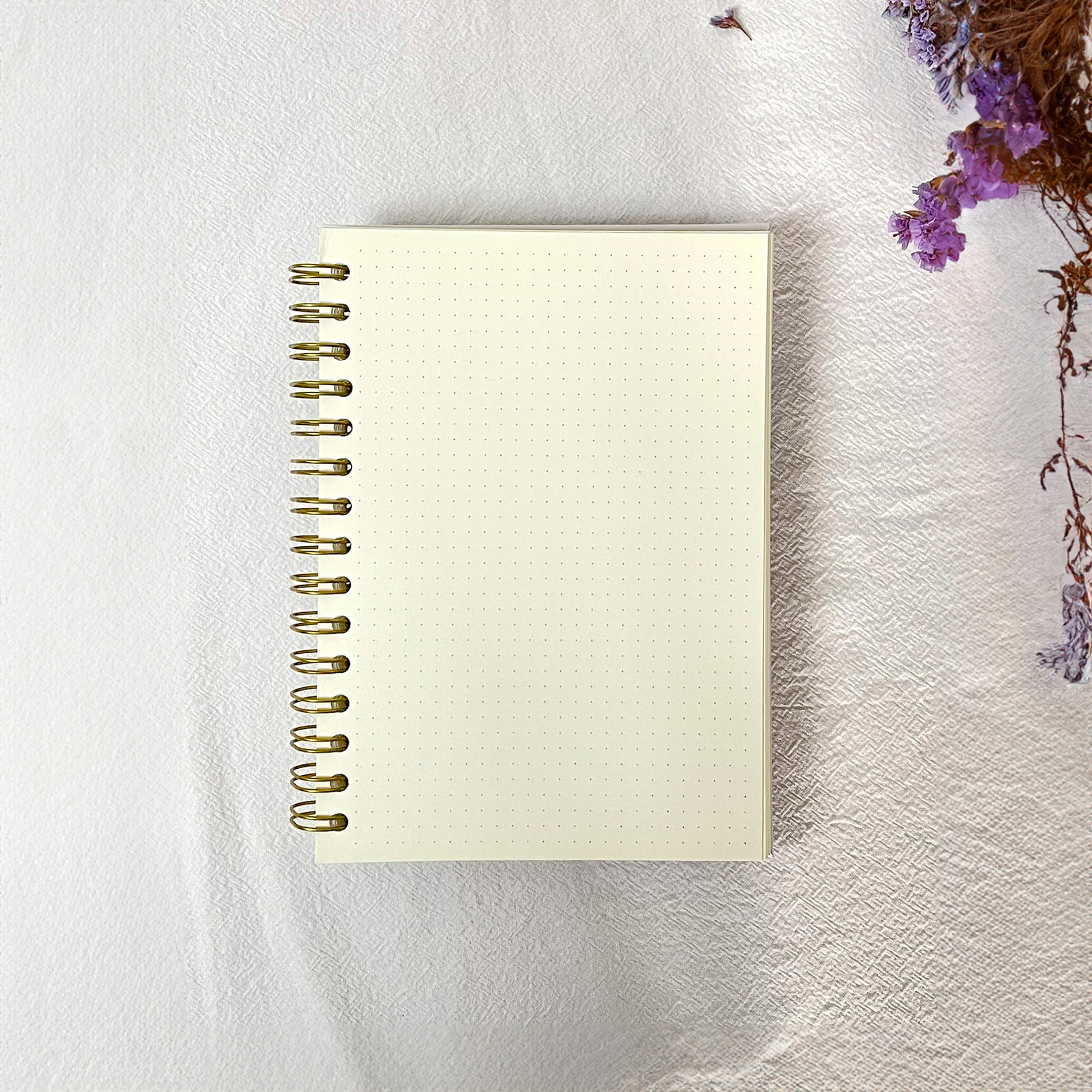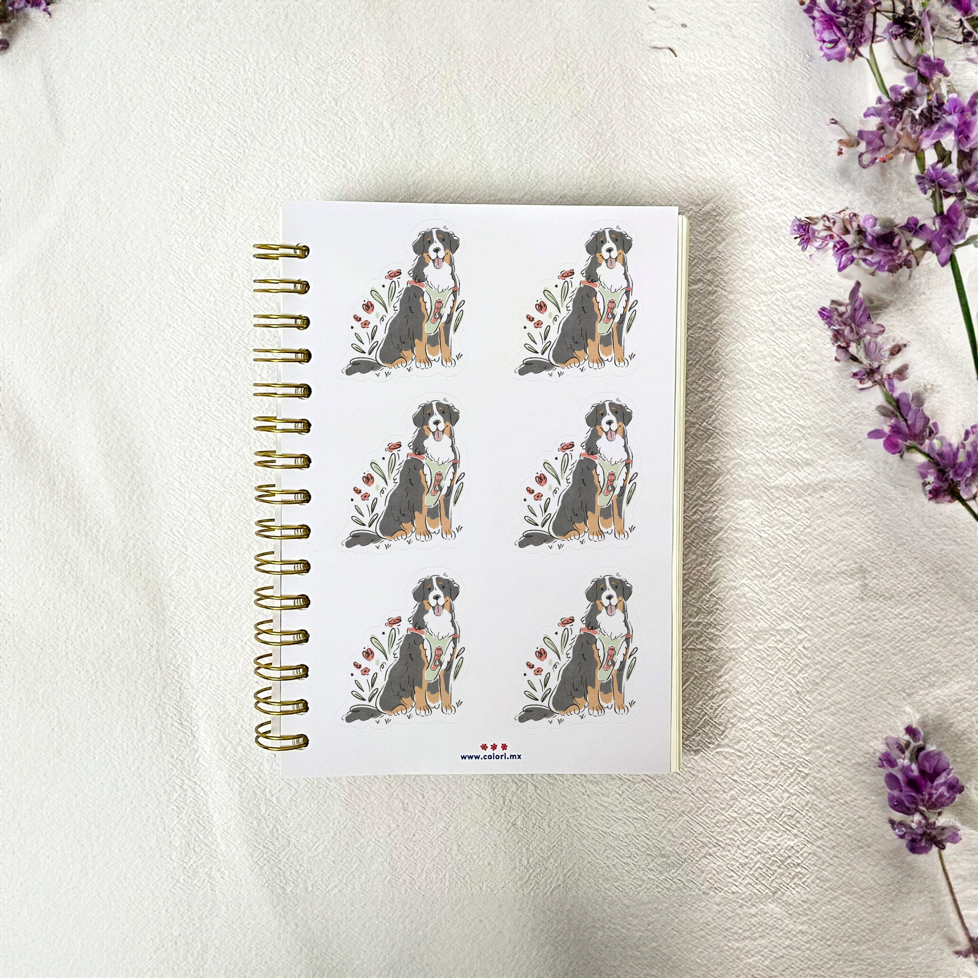 Portada ilustrada, 80 hojas punteadas de 90 g color hueso y 2 hojas de stickers personalizados.